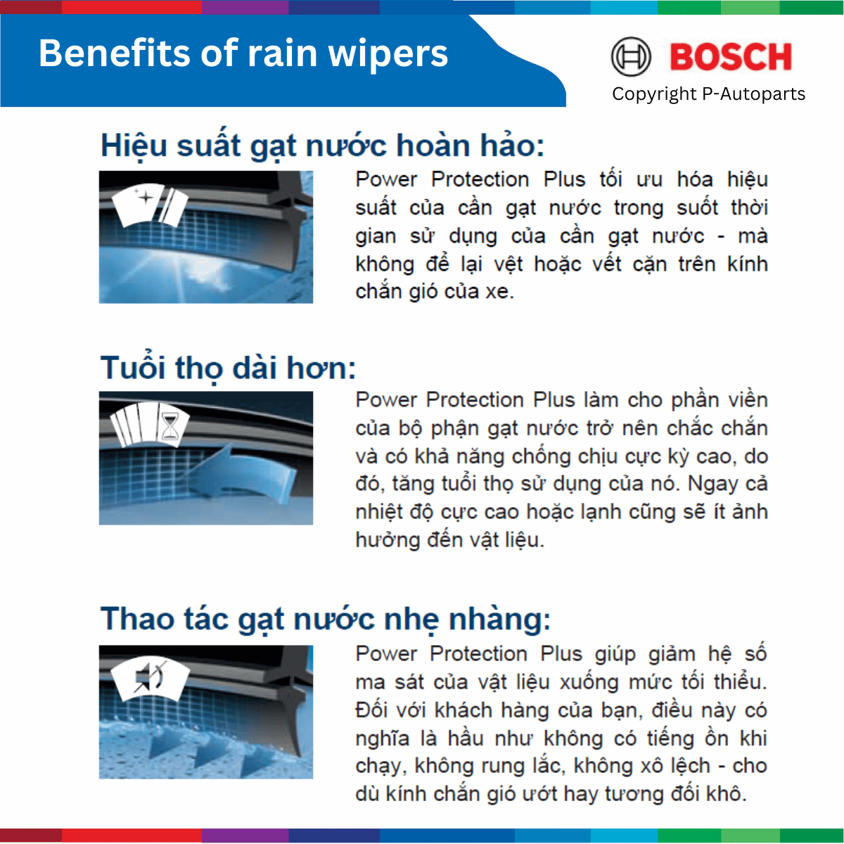 - Công nghệ Power Protection Plus Lưỡi gạt phủ lớp chống ma sát – bền hơn, hiệu quả hơn trong mọi điều kiện thời tiết.