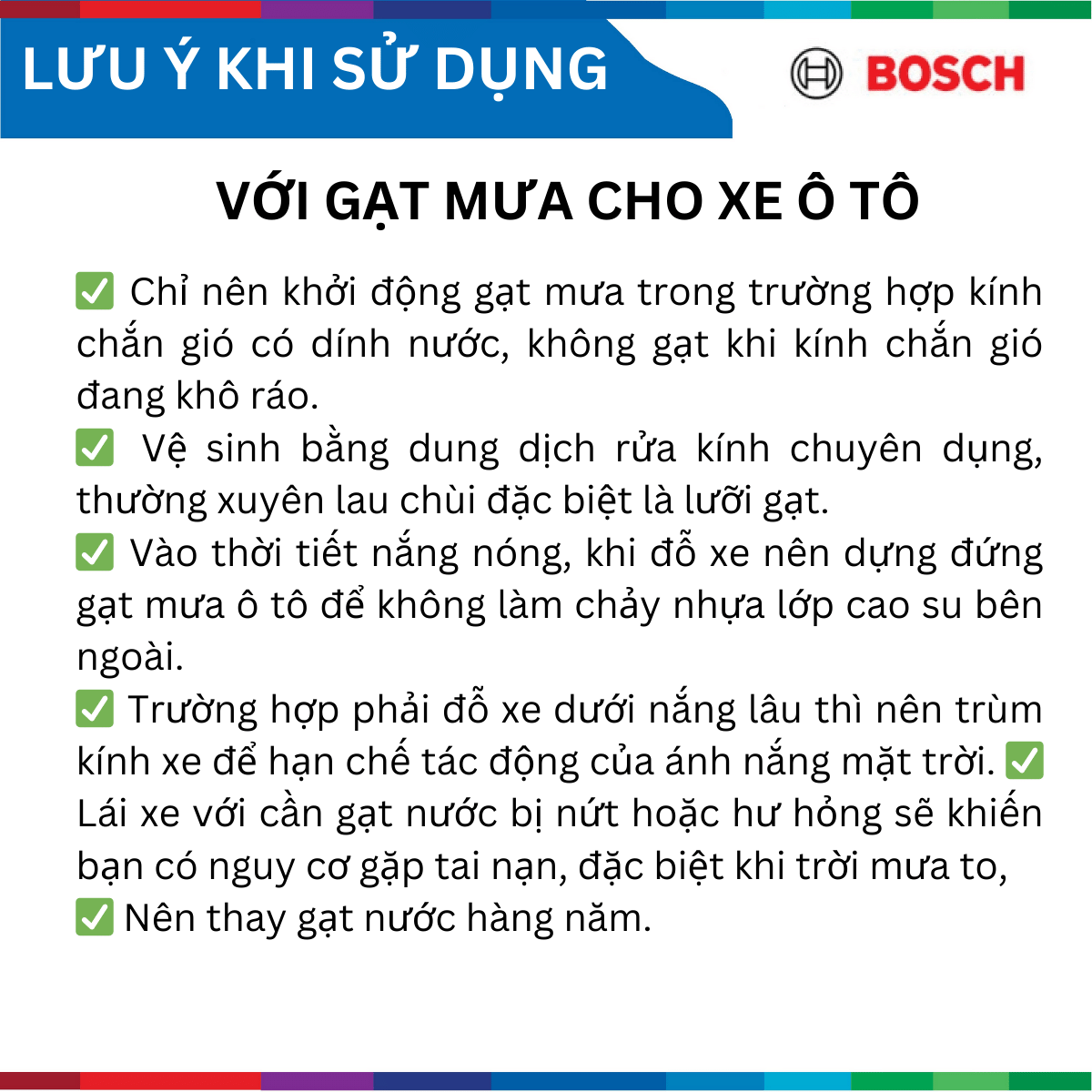 ✅ Vệ sinh bằng dung dịch rửa kính chuyên dụng, thường xuyên lau chùi đặc biệt là lưỡi gạt.