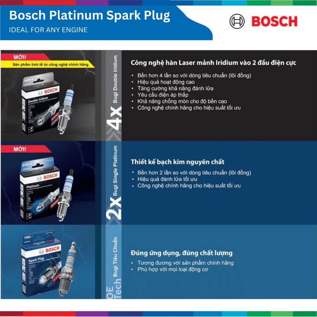 Theo các chuyên gia thì bugi ô tô dòng tiêu chuẩn cần được thay mới sau 30.000 km tới 40.000 km, với sự sáng tạo và phát triển không ngừng BOSCH đã cho ra đời các dòng sản phẩm với độ bền cao hơn bằng chất liệu Platinum và Iridium có tuổi thọ hoạt động và hiệu suất cao hơn