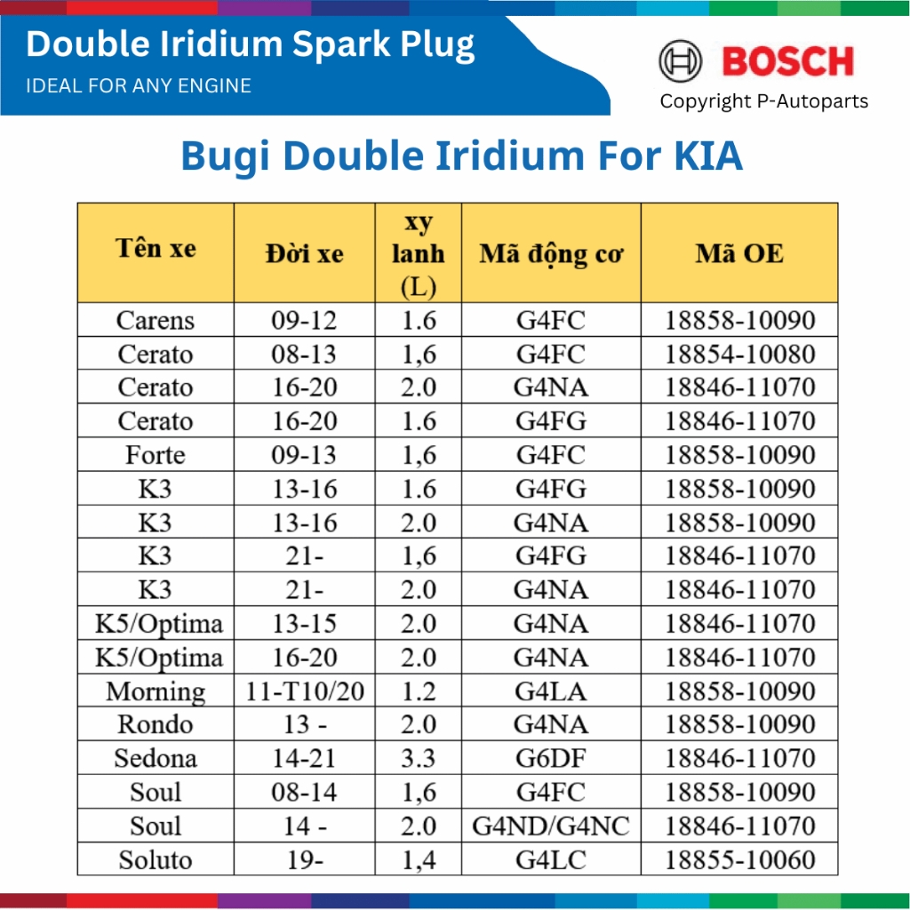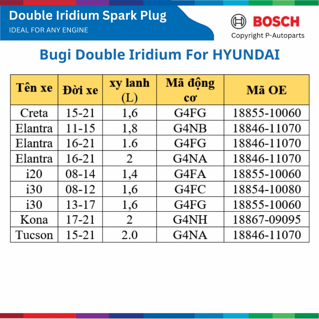 Bugi Double Iridium BOSCH YR7SII33U phù hợp Cerato K3 K5 Morning Sedona Soluto Creta Elantra Tucson