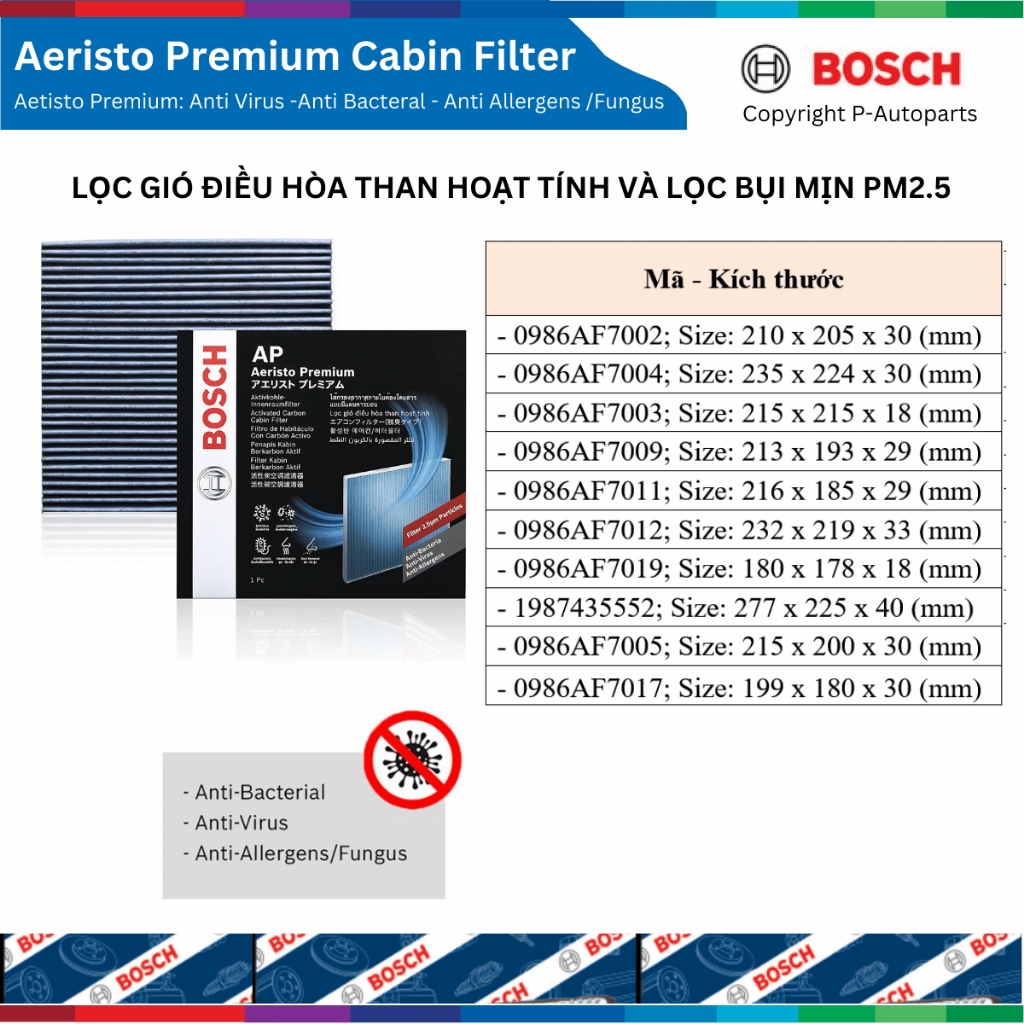 [Sỉ-Lẻ] Lọc gió điều hòa BOSCH Aeristo Premium than hoạt tính lọc bụi mịn PM2.5, xe Nhật Hàn Mỹ